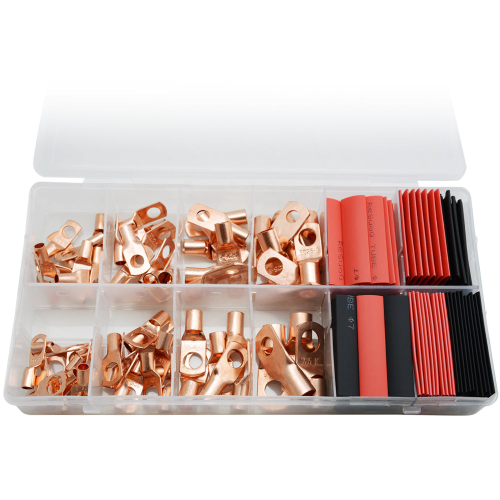 150Pcs Copper Wire Terminal Connectors, including 70pcs AWG 2 4 6 8 10 Copper Wire Lugs and 80pcs Heat Shrink Tubing for your work which meet your different needs.