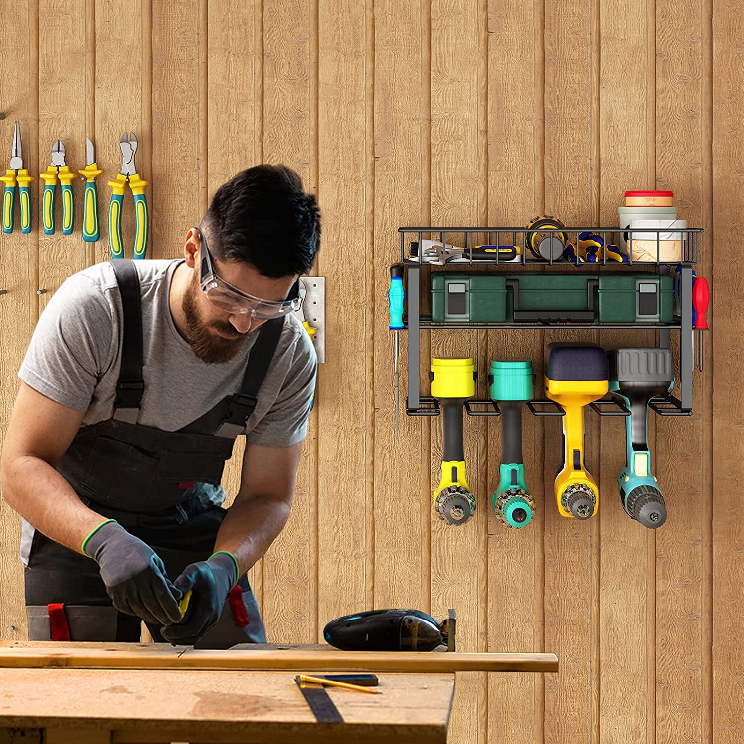Electric tool organizer, wall mounted drill frame with 2 side nail plates, 3-layer garage organization floating wireless heavy-duty tool organizer practical rack with 4 drill bit holders